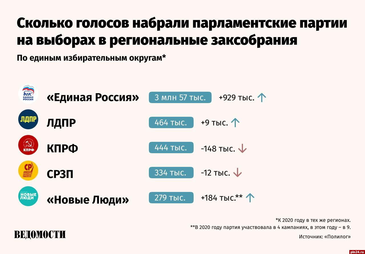 Минувшая неделя прошла у нас под знаком обсуждения итогов выборов. Кто их только не обсуждал, как только не интерпретировали результаты трехдневного голосования — как у нас в регионе, так и в целом по стране. Потуги некоторых партийцев — например, псковских коммунистов - выдать явные неудачи за успех в духе «Кто молодец? Я молодец!», честно говоря, вызывали только смех. Лучше всяких слов тут говорят цифры. О процентах на муниципальных выборах в Псковской области и полученных партиями депутатских мандатах мы уже достаточно подробно вели разговор неделю назад, а уже после этого были опубликованы и общие цифры по стране. К ним сейчас и обратимся. Как следует из подсчета голосов, отданных за парламентские партии на выборах в региональные законодательные собрания, ЛДПР все-таки обошла КПРФ и стала «партией №2» в стране. В то время как у коммунистов в сумме по регионам всего 444 тысячи голосов, и это почти на 150 тысяч меньше, чем на предыдущих выборах пять лет назад, у либерал-демократов — 464 тысячи. И это больше, чем у них было в 2020-м, и больше, чем у их основного оппонента.