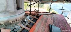 В ходе работ выполнена замена сгнивших балок перекрытий и протезирование отдельных элементов. Полностью проведена замена стропильная система. Монтаж выполнен из деревянного бруса, покрытого антибактериальным и противопожарным средствами защиты.