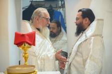 Его Высокопреосвященству сослужили: секретарь Псковского епархиального управления протоиерей Андрей Вахрушев, благочинный монастырей Псковской епархии иеромонах Иннокентий (Селезнев), настоятель Свято-Троицкого кафедрального собора города Пскова иерей Александр Короплясов, настоятель храма Архангела Михаила села Кобылье Городище иеромонах Никандр (Чебурахин).