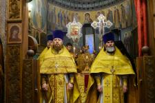 Его Высокопреосвященству сослужили: благочинный храмов города Пскова протоиерей Андрей Большанин, клирик храма святых равноапостольных Константина и Елены города Пскова протоиерей Роман Ледин, насельник Свято-Успенского Псково-Печерского монастыря иеромонах Анатолий (Подолян), клирик Свято-Троицкого кафедрального собора города Пскова иерей Кирилл Быков. Диаконский чин возглавил клирик Свято-Троицкого кафедрального собора города Пскова диакон Антоний Кармазин.