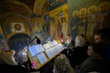 Песнопения Литургии исполнил Архиерейский хор Псково-Печерского монастыря под управлением Марии Быковой. За богослужением молились многочисленные прихожане и паломники.