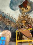 На место возвращено приведенное в порядок паникадило. Светильник установили, выправив соотношение оси размещения. Она единая для солеи и царских врат.