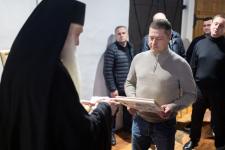 В рамках торжественной церемонии губернатор Псковской области Михаил Ведерников и игумен Игнатий обменялись памятными дарами, включая картины, крест и сувениры.