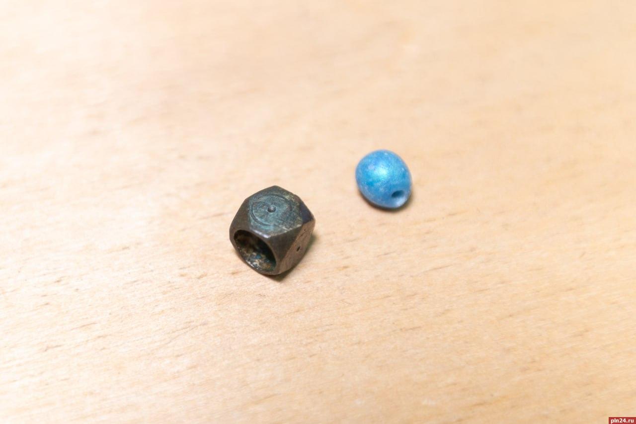 Еще одна интересная находка - бронзовый бубенчик. «Это нижняя часть шумящей привески. В Изборском музее такое украшение используется в оформлении археологической экспозиции. Шумящие привески чаще всего носили женщины, это и украшение, и оберег.