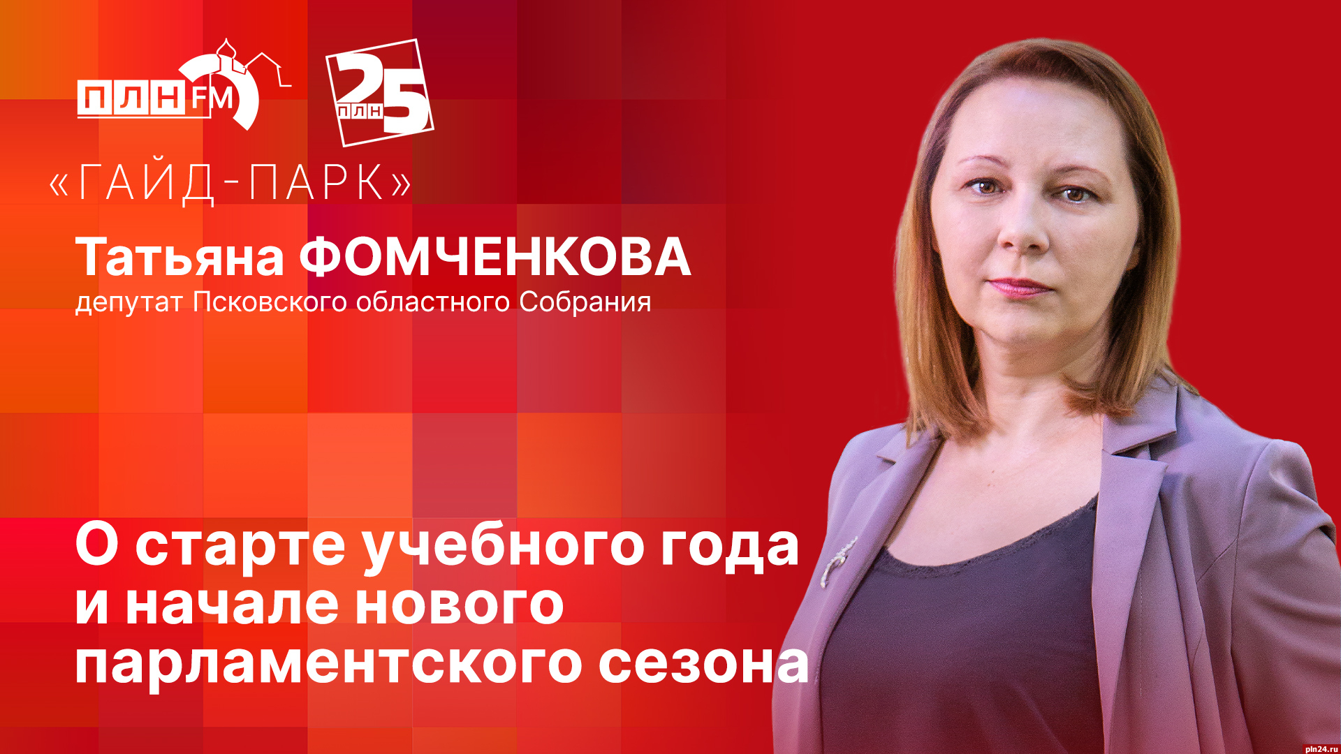 Слушайте в эфире радио «ПЛН FM» (102.6 FM) новый выпуск программы «Гайд-парк». Гость студии - депутат Псковского областного Собрания по округу №5 (Великие Луки), директор гимназии имени Софьи Ковалевской Татьяна Фомченкова.