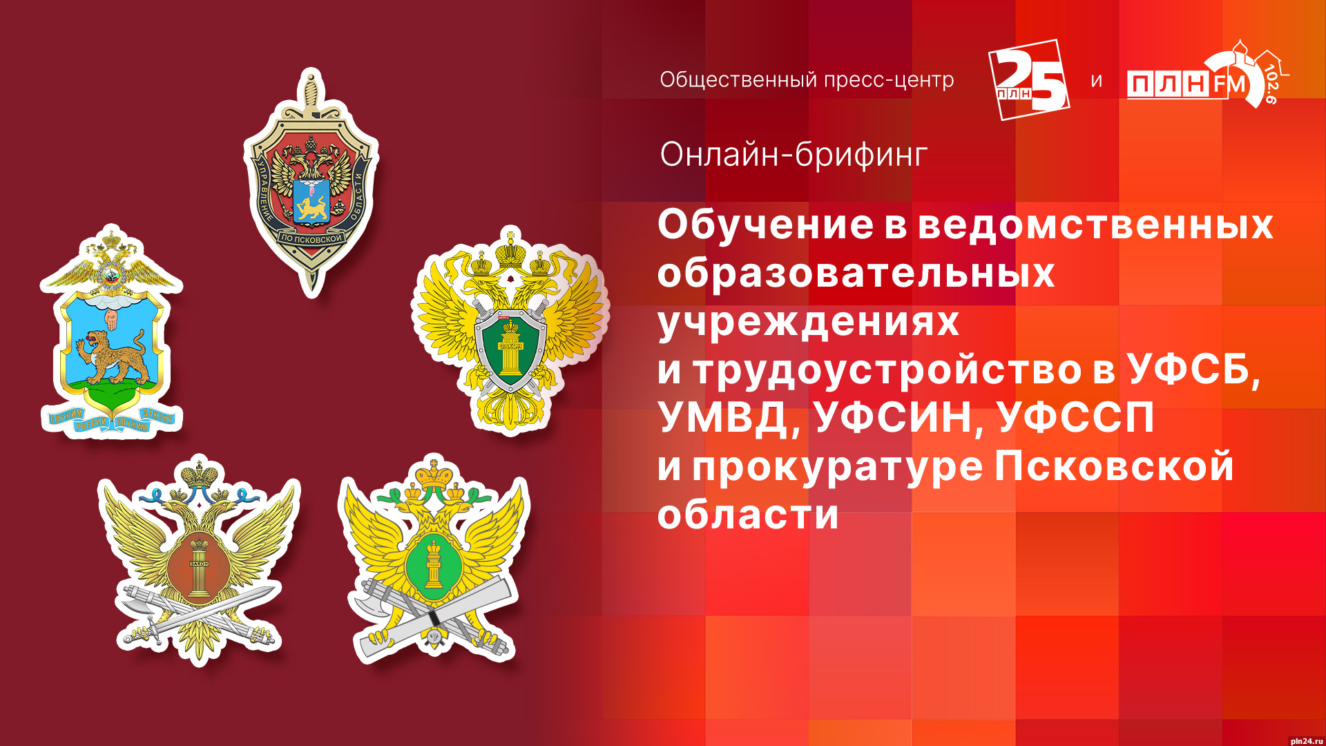 Очередной брифинг пройдет в объединенном пресс-центре Псковской Ленты Новостей и радио «ПЛН FM». Ключевой темой разговора станет обучение в ведомственных образовательных учреждениях и трудоустройство в УФСБ, УМВД, УФСИН и прокуратуру Псковской области.